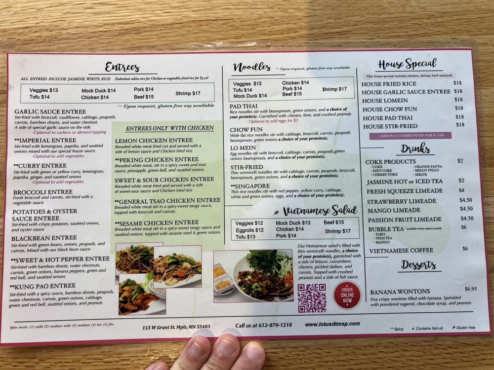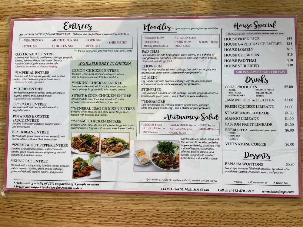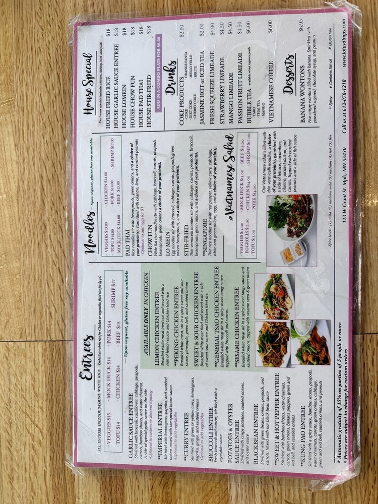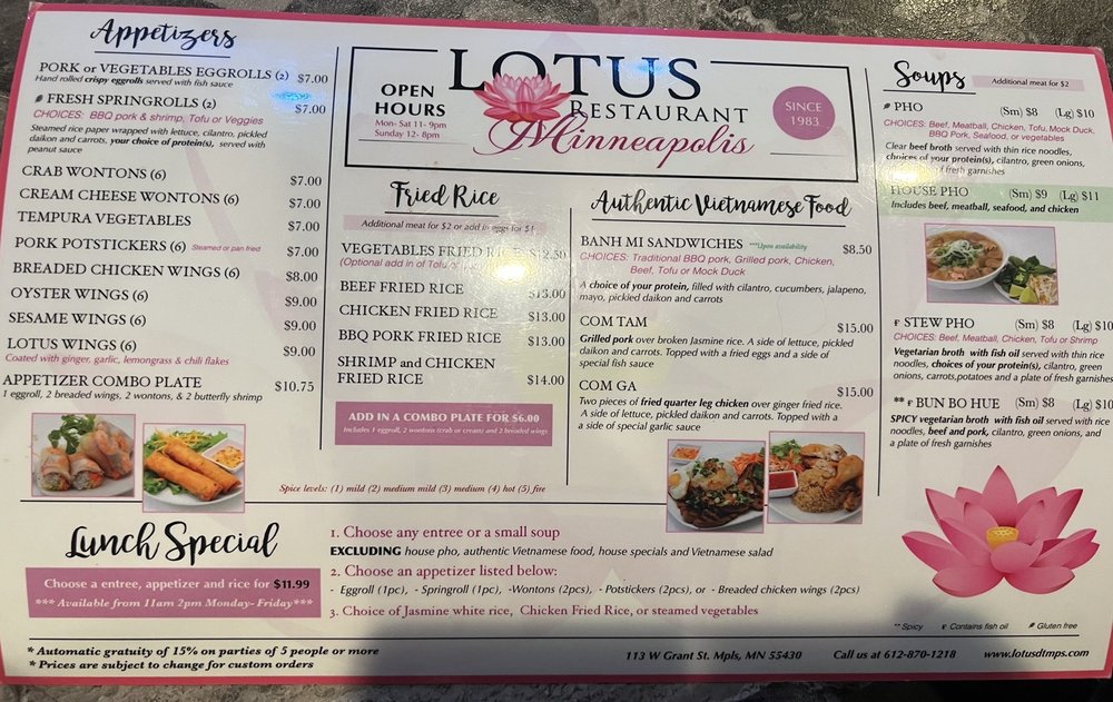 Welcome to Lotus Restaurant Minneapolis, a vibrant hub for Vietnamese cuisine nestled in the heart of Minneapolis at 113 W Grant St. With a passion for delivering authentic flavors and fresh ingredients, Lotus stands out in the city's rich culinary landscape. Known for its delightful array of dishes, this restaurant has quickly garnered a loyal following among food enthusiasts and casual diners alike.