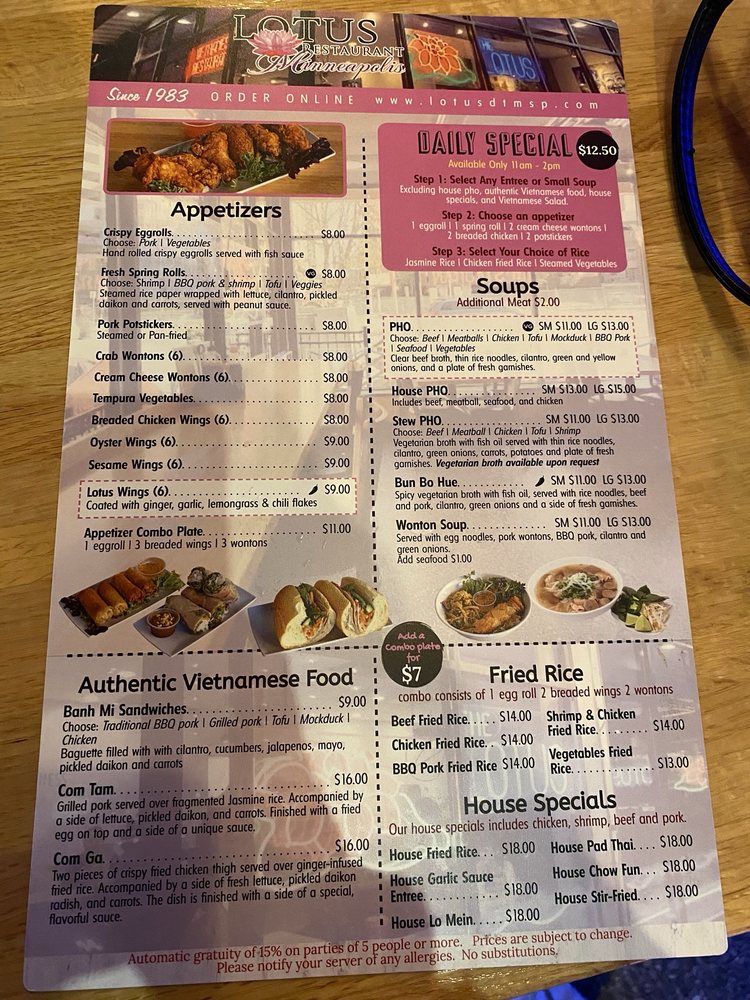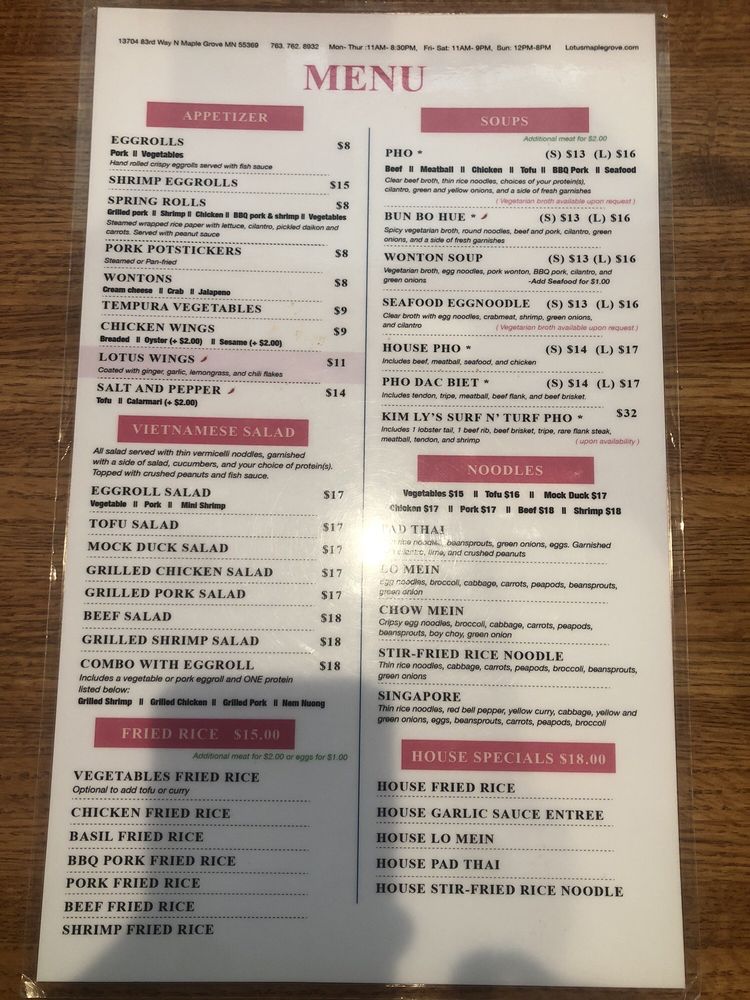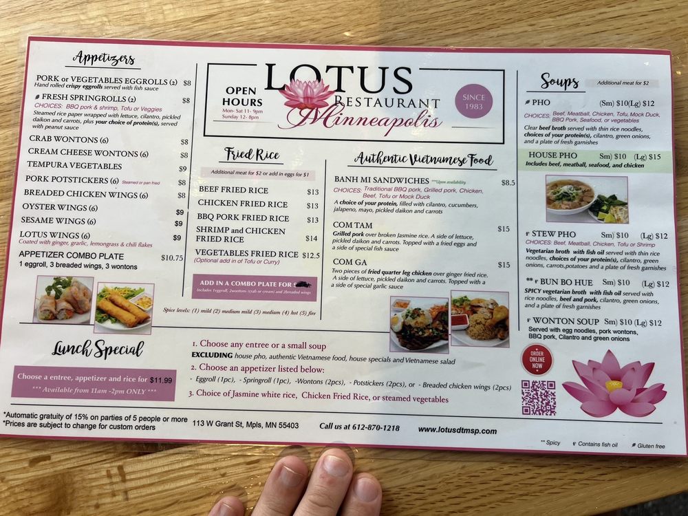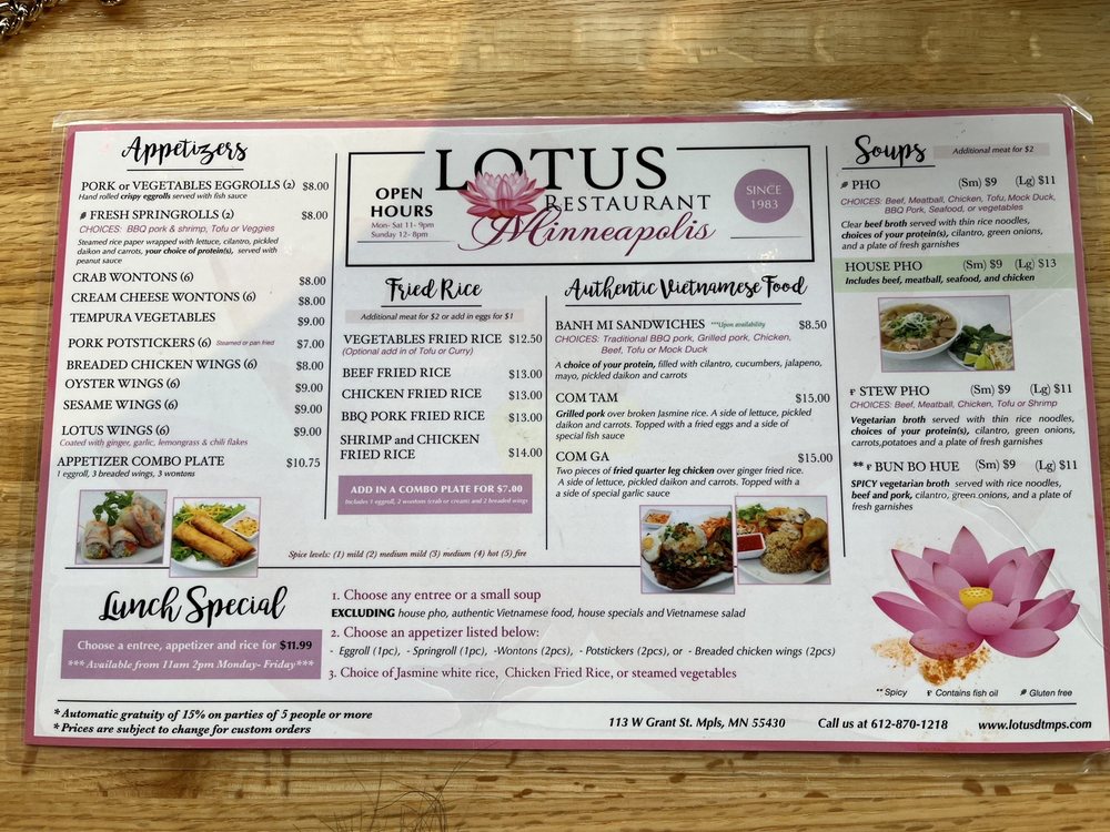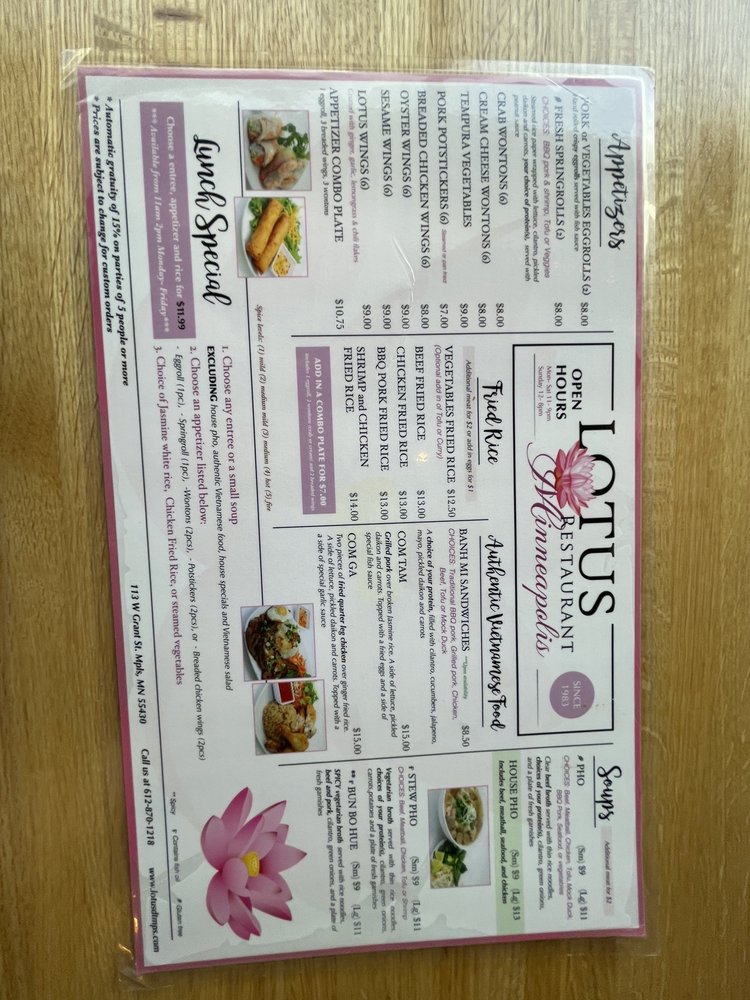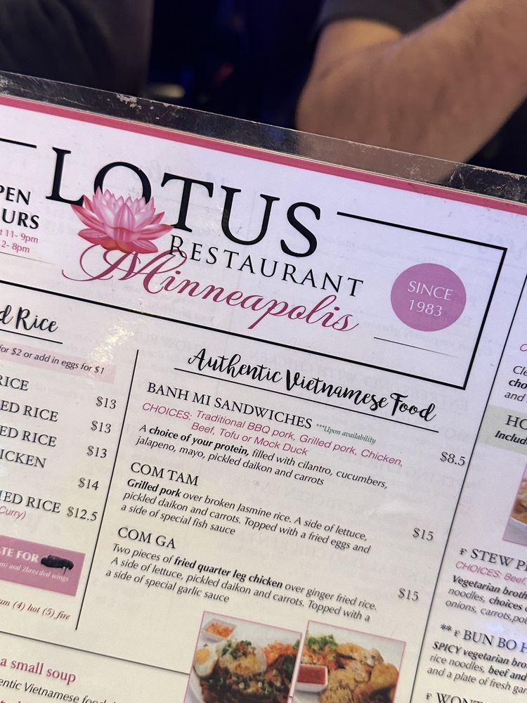 “ Lotus is hands down one of my favorite restaurants in Minneapolis! Ive been here over a dozen times, and every single visit has been phenomenal. The food is consistently fresh, flavorful, and satisfyingno matter what I order, it never disappoints. The staff here are entirely too kind, always welcoming and making sure every experience is a great one. Their hospitality really sets them apart. My absolute favorite dishes are their house pho and egg rollsboth are unbeatable! The pho is rich, comforting, and packed with flavor, while the egg rolls are perfectly crispy and delicious. If you havent been to Lotus yet, youre missing out. Ill definitely be back again and again! ”